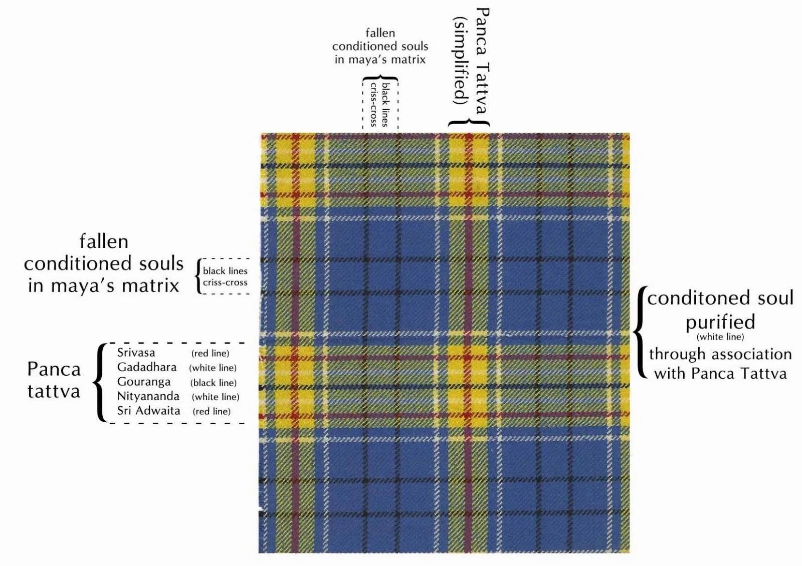 “The broad yellow band is the golden effulgence of Lord Gauranga, who is in the middle (black line). There are five lines running through this yellow band. Each line representing a member of the Panca Tattva. The black lines criss-crossing on the blue background represent the fallen conditioned souls in maya’s matrix. When these fallen conditioned souls come into association with the Panca Tattva they become purified (represented by the white lines either side of the Panca-Tattva).”