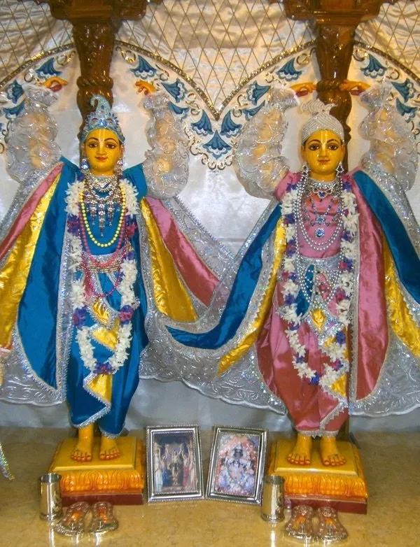 Sri Sri Khoda Nitai Mayapur Shashi are the presiding deities at Karuna Bhavan. On the left is Lord Nityananda and on the right is Lord Caitanya, known together as Sri Sri Gaura Nitai. They were originally fashioned in New Vrindavan, West Virginia and were worshipped for the first time at the Berkeley Temple in San Francisco, USA. They arrived on the auspicious day of Ram Navami at Glasgow Airport in the spring of 1996.